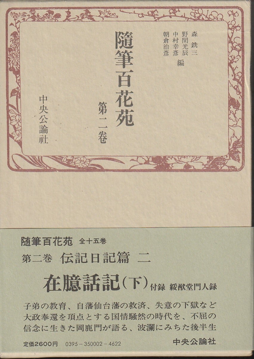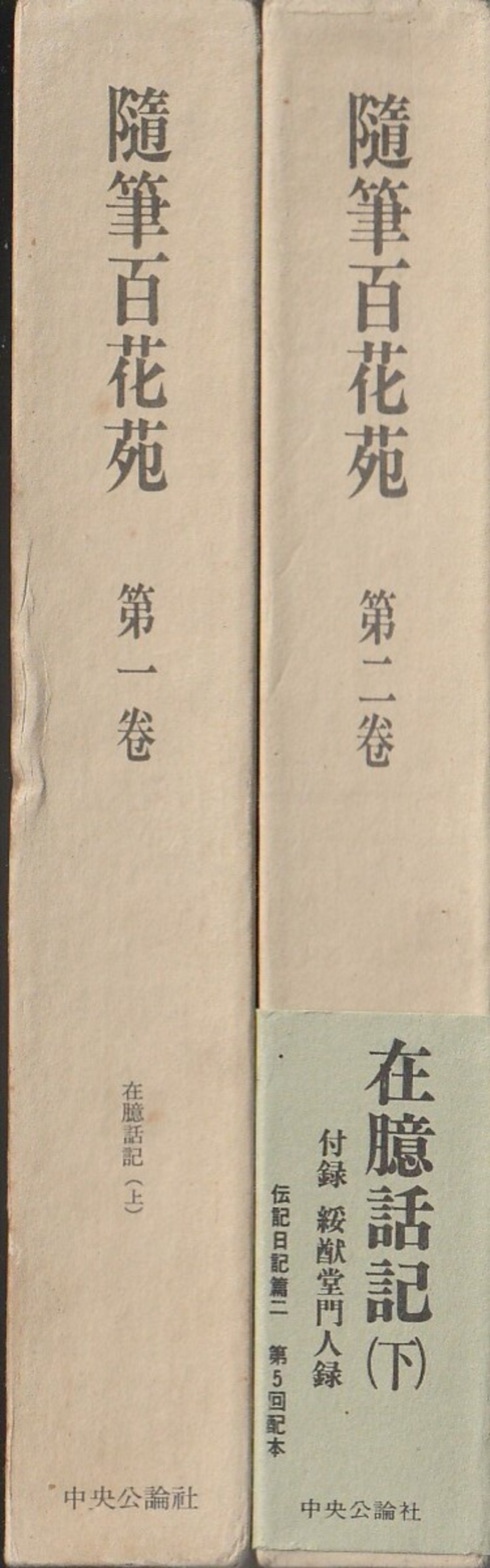 状 態:『随筆百花苑』第一巻「在臆話記(上)」・第二巻「在臆話記(下)」の2冊セット。第一巻:函あり(背にヘコミ・シミなどダメージあり※画像1枚目参照)、帯なし、月報あり、本体ページ天のどに少々シミあり。その他まずまず良好です。